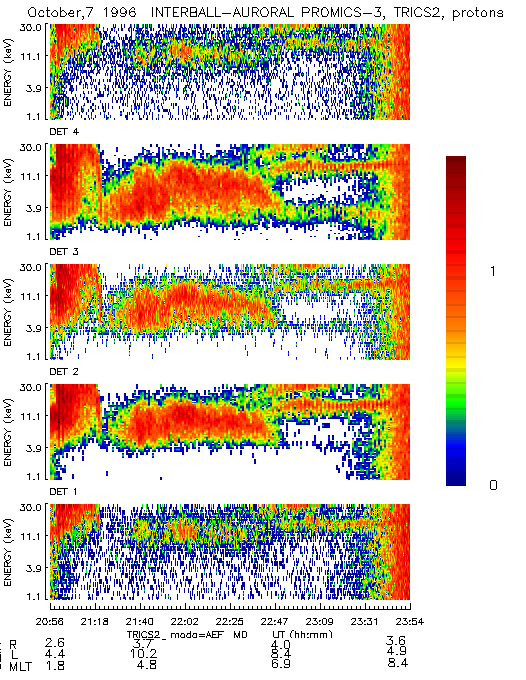 - Auroral oval crossing in postmidnight-morning sector. In the middle - plasma sheet protons, at the sides - ring current protons. The five panels - count rates at different directions to the satellite rotation axis.